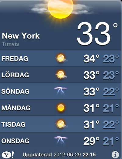 Nästa vecka ska det bli runt 30-35 grader varmt i New York. Lägg till runt 70% luftfuktighet så inser ni att det kommer att bli som att gå in i en vägg. Det känns lite som att någon går framför dig och blåser dig i ansiktet med en hårfön. Det finns dock inget som kunde bekymra mig mindre. Jag har haft en månad av svensk sommar nu och har en till när jag kommer hem, att behöva vara 4 veckor i ett svettigt New York är kanske det minsta problemet jag kan tänka mig. Jag får väl hålla kroppstemperaturen nere med obscena mängder frozen Margaritas om det skulle skita sig.