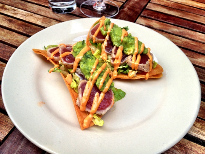 På tavlan kan jag läsa (knappt, jag lever utan glasögon på semestern och är i stort sett legally blind) att det finns en handfull saker att välja på, allt burgare av olika slag, och jag slår till på en Bistro Burger för 8 dollar.