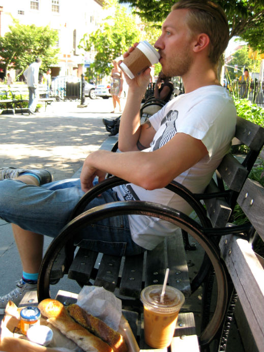 Ja, så var det ju det här med att köa. Jag hade tänkt mig en laxbagel från Russ & Daughters på East Houston, för de ska tydligen vara bäst i stan. Men jag hade verkligen inte lust att stå i den här kön. Det blev en lite mer anspråkslös bagel från Dunkin’ istället. Inte dumt det heller.