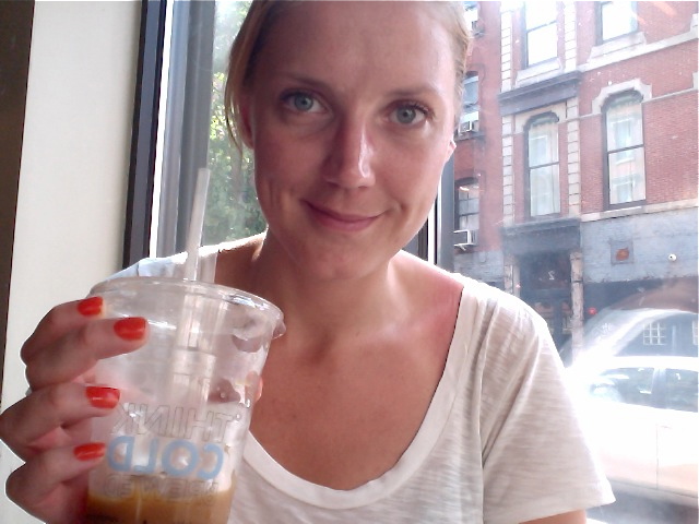 Nu sitter jag på Think Coffe på Bowery och svalkar mig och ska snart bege mig till lägenheten som ligger precis här och få nycklar och sånt. Kvinnan jag hyr av ska inte åka till Sverige förrän i morgon så jag ska möta upp min kompis Hanna som bor några blocks härifrån i SoHo och sova första natten hos henne.
