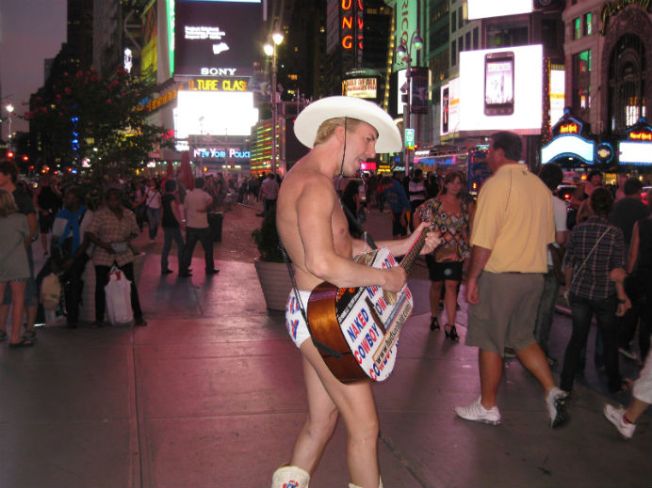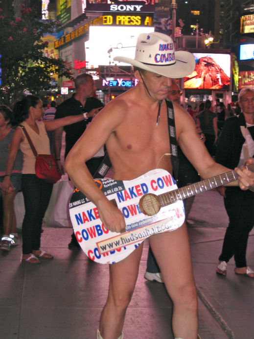 Det var gatuartisten Robert John Burck som började som Naked Cowboy på Times Square 1998 och nu har han gjort ett franchise av det hela där man kan ansöka om att få var en naked cowboy eller cowgirl. Burck själv han meddelat att han ska ställa upp i presidentvalet till hösten som representant för Teaparty-rörelsen.