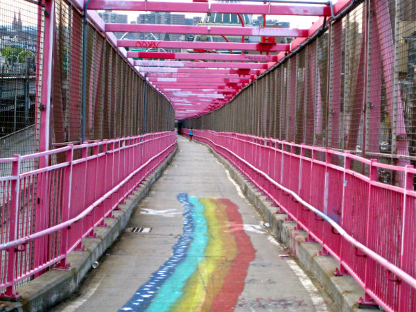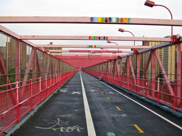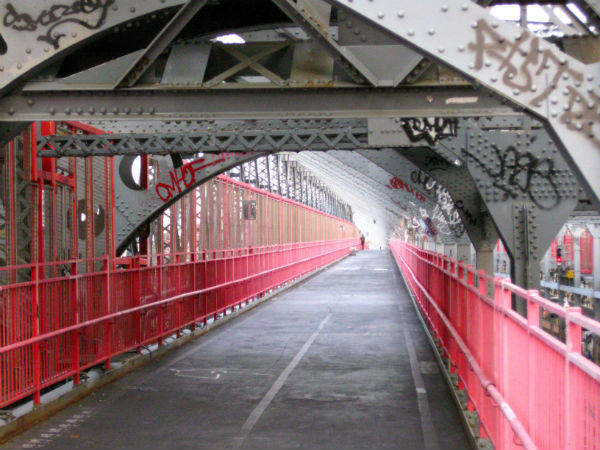 I sin rosa och gråa stålkonstruktion är den inte på långa vägar lika vacker som sin granne Brooklyn Bridge, men Williamsburg Bridge har ändå sin charm. Ruffig och kaxig på nåt sätt. Den började byggas 1896 och har 8 bilfiler, två tågrälsar, cykel och gångväg. Bron är 2227 meter lång och befinner sig 41 meter över vattnet.